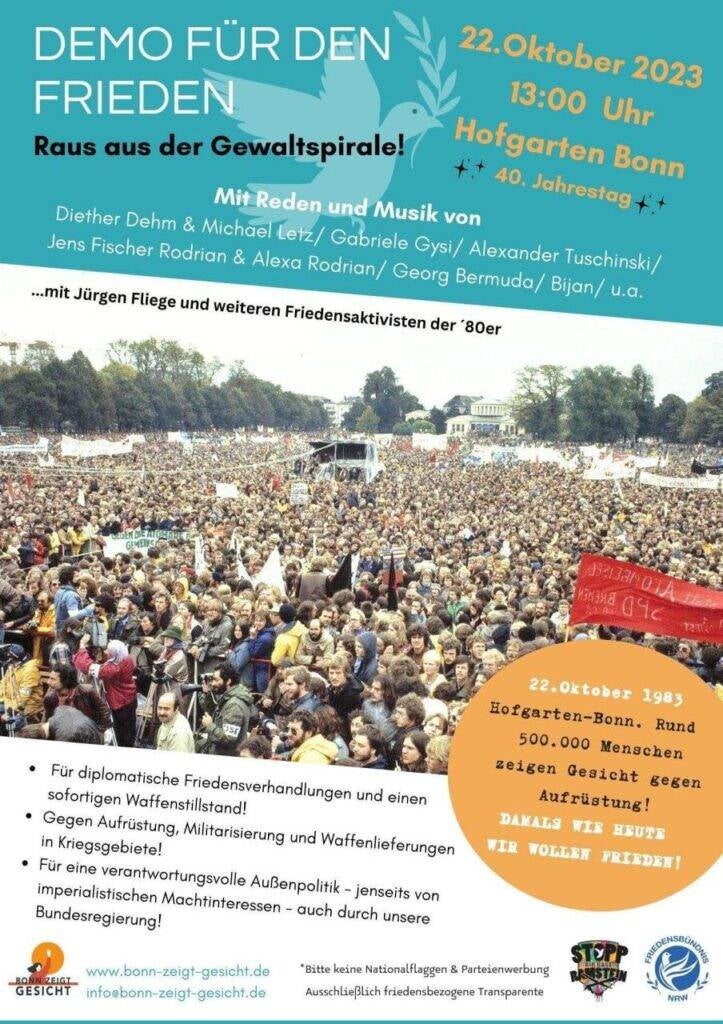 Ankündigung großer Friedensdemo in Bonn am 22.10.23 im Hofgarten, 13 - 17:30 Uhr