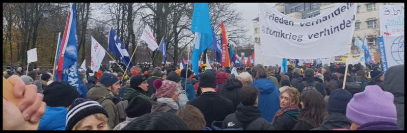Wir befinden uns, wie auch Michael Müller betonte, bereits in einem Weltordnungs- und Wirtschaftskrieg, in dem es zig heiße Kriege und dabei zwei besonders gefährliche mit dem Potential der globalen Eskalation gibt. Und v.a. auch deswegen ist es unvergleichlich schwieriger als in den 80er Jahren, Hunderttausende oder gar Millionen Menschen auf die Straße zu bringen. Wir - als Deutschland und Teil des sog. Westens - sind nicht nur zutiefst involviert, sondern auch Triebkraft, daher muss die Bevölkerung, wie es Sarah Wagenknecht treffend bezeichnete, in die Kriegsstrategie "hineingelogen" werden. Dazu gehört auch das simplifizierte Freund-Feind-Schema, welches innenpolitisch exakt genauso angewendet wird, wie außenpolitisch das Opfer-Täter-Narrativ. Da wird massiv gespalten, Solidarität abgeschafft bzw. nur in eine gewollte Richtung gelenkt und gerade von den Ärmeren und überhaupt aus den Sozialsystemen das Geld für die Militarisierung genommen und als Sahnehäubchen noch moralisch untermauert. Man müsse sich mit der Bundeswehr und den milliardenschweren Rüstungskonzernen solidarisieren, schließlich bräuchten sie das Geld für hehre Ziele. Und dabei bleibt es nicht, man braucht auch das Leben der Menschen für seinen Kriegskurs. Daher ist neben der unsäglich verblendenden und heuchlerischen Bundeswehrkampagne wieder die (jetzt sogar) genderisierte Wehrpflicht in aller Munde - also für alle, die nicht bei drei auf den Bäumen sind. Inmitten der emotionalisierten und moralisierten Kriegspropaganda nun eine millionenschwere Friedensbewegung aufzubauen, gleicht einer Sisyphusarbeit und scheint beinahe unmöglich. Zumindest soll es uns unmöglich gemacht werden. Daher waren diese über 20.000 Menschen am Samstag ein voller Erfolg und damit ein Treffer auf Goliaths Stirn!