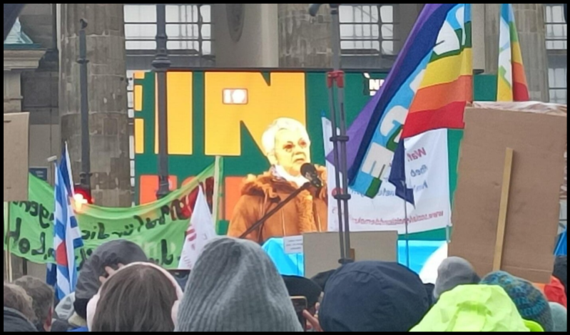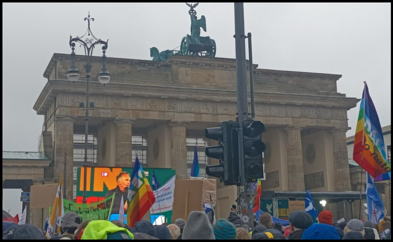 „...Wir wenden uns von dieser Demonstration gegen den sozialen Krieg in unserem Land. Über 90 Milliarden für Rüstung und Krieg, während gleichzeitig alle Haushaltsziele für Soziales, für Umwelt, für Bildung, für Wissenschaft, für Gesundheit gekürzt und gestrichen werden...