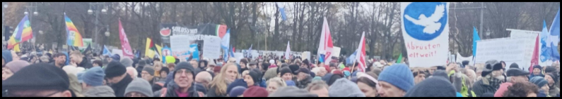"Militärisch abrüsten, diplomatisch/politisch aufrüsten" muss demnach das Gebot der hochgefährlichen Stunde sein, weswegen sich alle Redner und massenweise Demonstranten mit ihren Losungen genau dafür einsetzten.